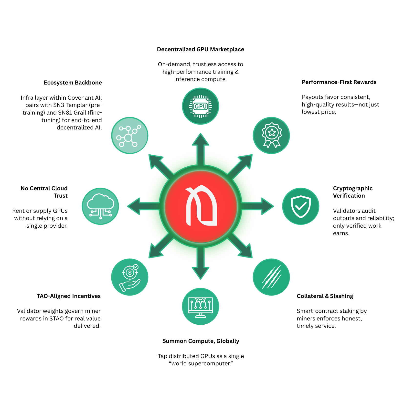 Basilica’s target users are AI researchers, developers, and organizations that require scalable and trustworthy GPU computing for machine learning tasks. Instead of relying on centralized cloud GPU providers, they can “summon compute” from Basilica’s decentralized network. The Bittensor substrate blockchain underpins Basilica’s economy – validators assign weights to miners based on the value of their contributions, which in turn governs the mining rewards in TAO (the Bittensor token). In summary, Basilica offers a way to rent out or utilize GPU power without trusting a central entity, because the network itself handles verification of hardware and results, and rewards only those providers who perform well. This is a critical piece of the broader Covenant AI ecosystem, serving as the infrastructure layer alongside Subnet 3 Templar (focused on model pre-training) and Subnet 81 Grail (focused on fine-tuning), to enable end-to-end decentralized AI development.