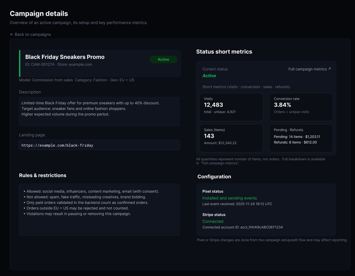 BitAds is built as a blockchain-based advertising platform integrated with real-world e-commerce tracking tools. The team has developed a system where an advertiser can connect a tracking pixel and their Stripe payment account to the BitAds network. In practice, a brand installs the BitAds Pixel on their website (to log visitor clicks/referrals) and links BitAds to their Stripe checkout or store backend. This allows BitAds to collect data on ad-driven visits and tie them to actual purchase events (Stripe-confirmed sales) in a secure, verifiable way. When an advertiser wants to launch a campaign, they stake a certain amount of SN16 (Alpha) tokens to “own” a portion of the marketing bandwidth on the subnet. This stake serves as the budget for the campaign.