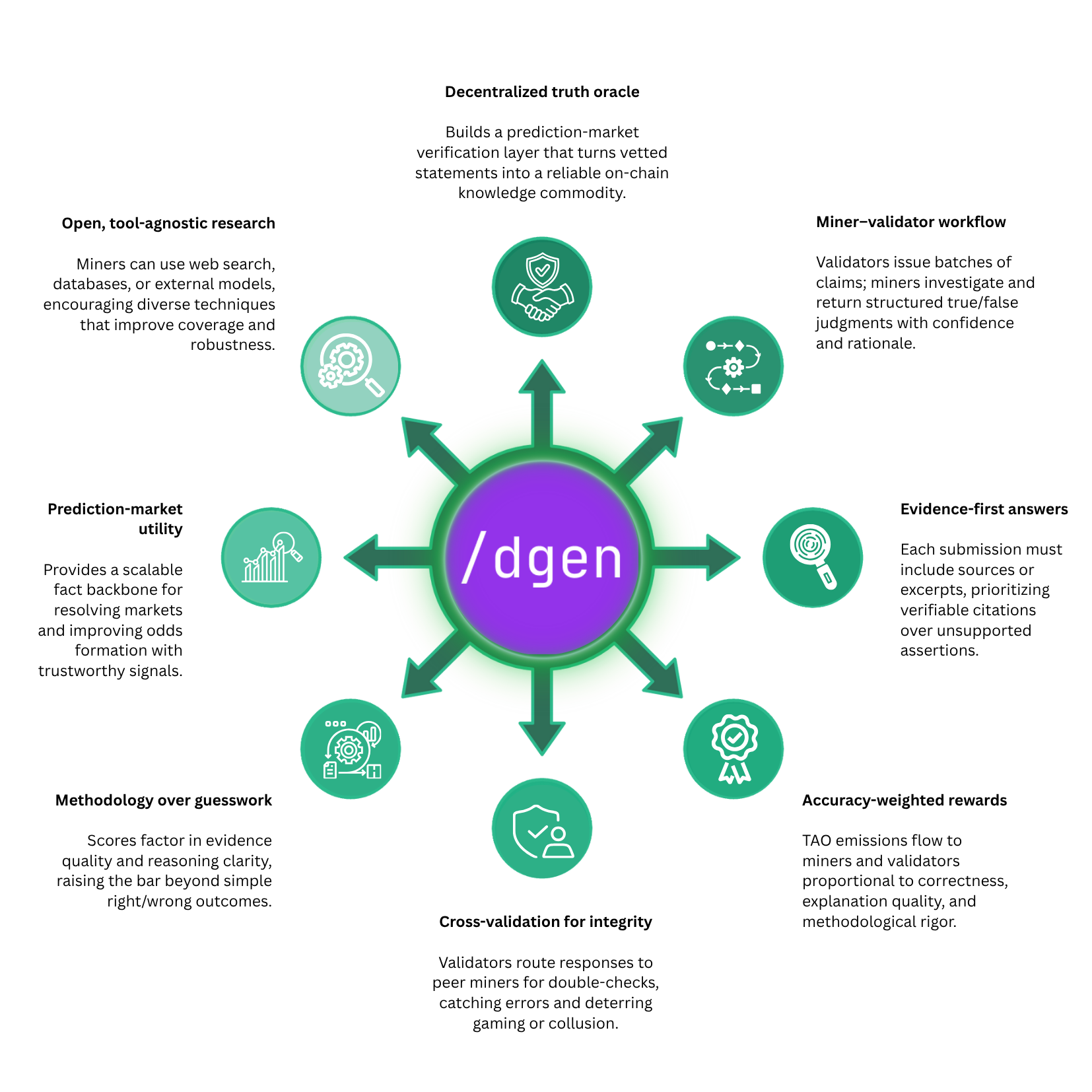 The Brain subnet (SN90) is a specialized Bittensor subnet for truth verification in prediction markets. According to its creators, Brain “is designed to create a decentralized prediction market verification system”. In practice, Brain miners are given factual statements or claims and must determine whether each is true or false (often with a confidence score). Validators then check the miners’ work for accuracy and sound methodology. The goal is to generate a reliable “truth oracle” – a digital commodity of verified statements – within the Bittensor ecosystem. More accurate miners (and validators) earn a larger share of TAO token emissions, providing incentive alignment. In Bittensor’s network of subnets (each focusing on a distinct AI task), Brain occupies the niche of fact-checking/prediction validation.