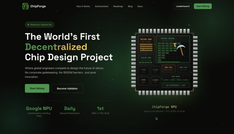 ChipForge is a Bittensor subnet (No. 84) that crowdsources hardware (chip) design through blockchain incentives. In essence, it organizes open on-chain “challenges” for designing silicon components (AI accelerators, cryptographic modules, mini-GPUs, RISC-V cores, etc.). Participants (called miners in Bittensor) download a challenge specification (often a Verilog/SystemVerilog problem description), use AI tools or manual engineering to craft a hardware design, and submit their completed Verilog solutions to the network. A set of validators (running industry-standard EDA toolchains like Verilator, Yosys, OpenLane, etc.) automatically evaluates each submission’s functionality, timing, power and area. The highest-scoring designs earn TAO (Bittensor token) rewards. All submitted solutions and scores are recorded on-chain, building a public archive of open-source chip designs.