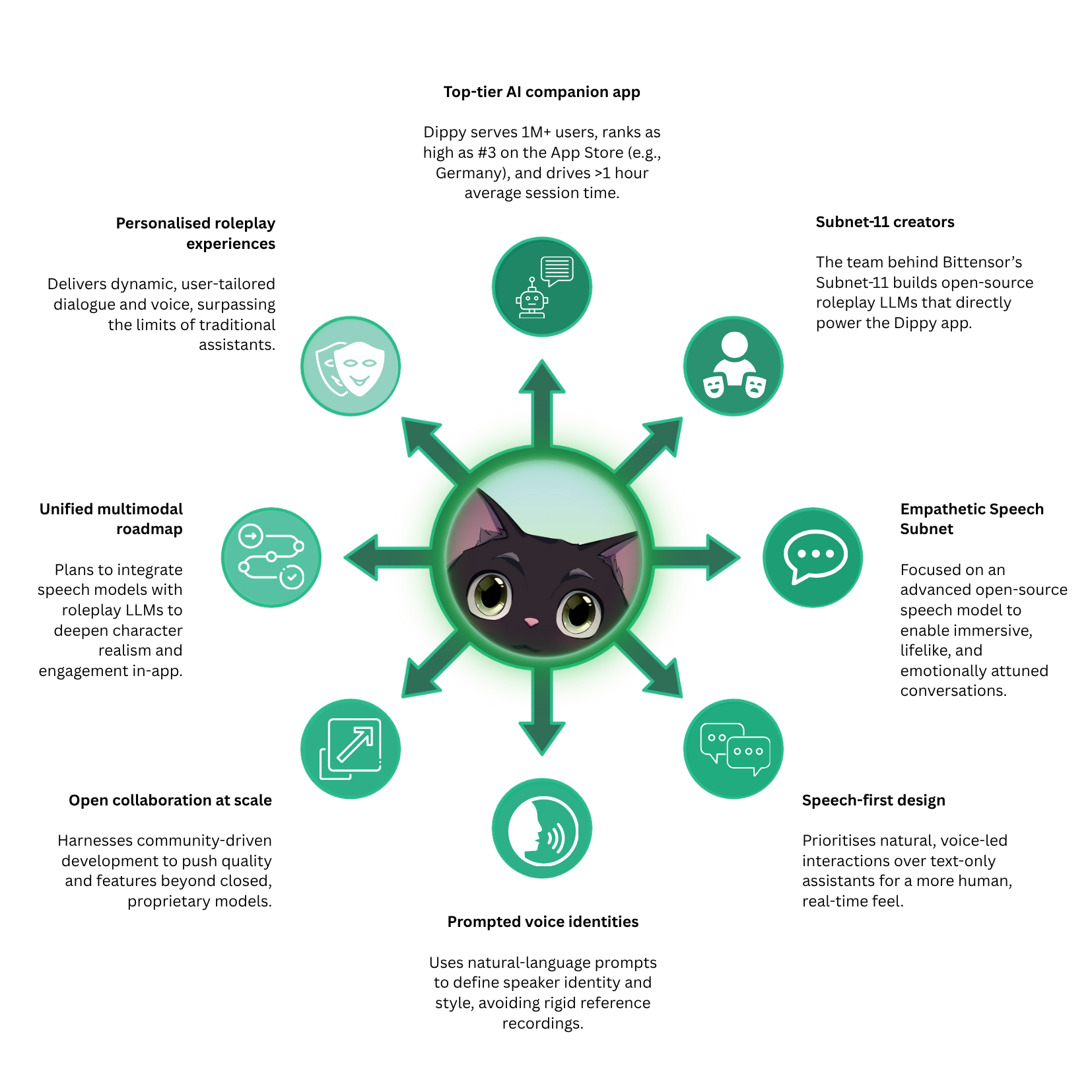 Their Dippy Empathetic Speech Subnet is focused on developing the most advanced open-source speech model, designed to enable immersive and lifelike AI interactions. By harnessing the collaborative power of the open-source community, they are addressing the growing demand for AI companions that prioritise natural, speech-first engagement. Their goal is to create a model that delivers deeply personalised, empathetic speech interactions—surpassing the limitations of traditional assistants and proprietary models.