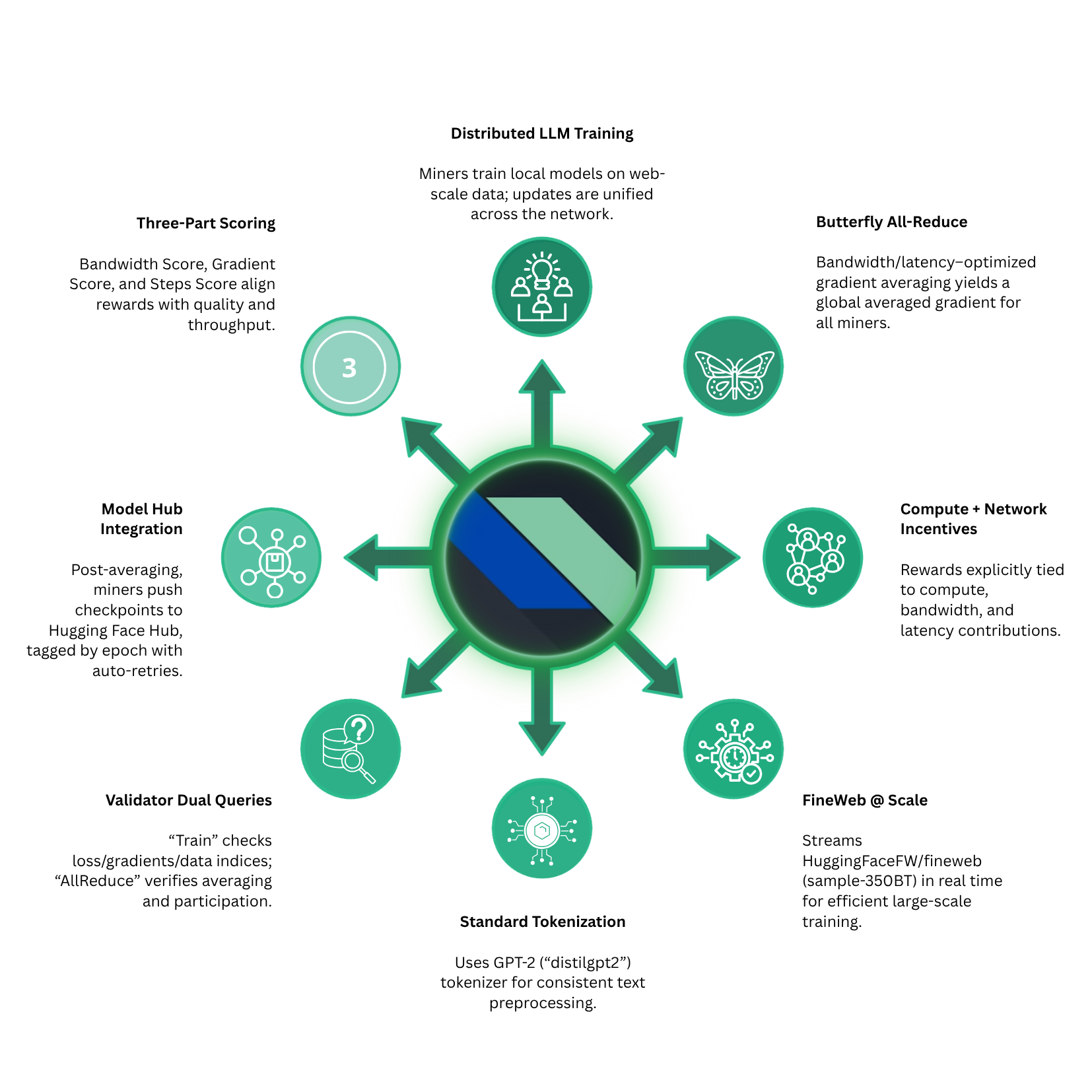 This subnet uses a distributed approach to train Large Language Models on web-based datasets. Their proposed solution is a subnet that incentivizes compute, bandwidth, and latency. Compute resources drive the training of each miner’s local model, while bandwidth and latency facilitate the averaging of local model weights using a process called butterfly all-reduce. Once this process is completed, every miner receives a unified global averaged gradient to update their model weights.
