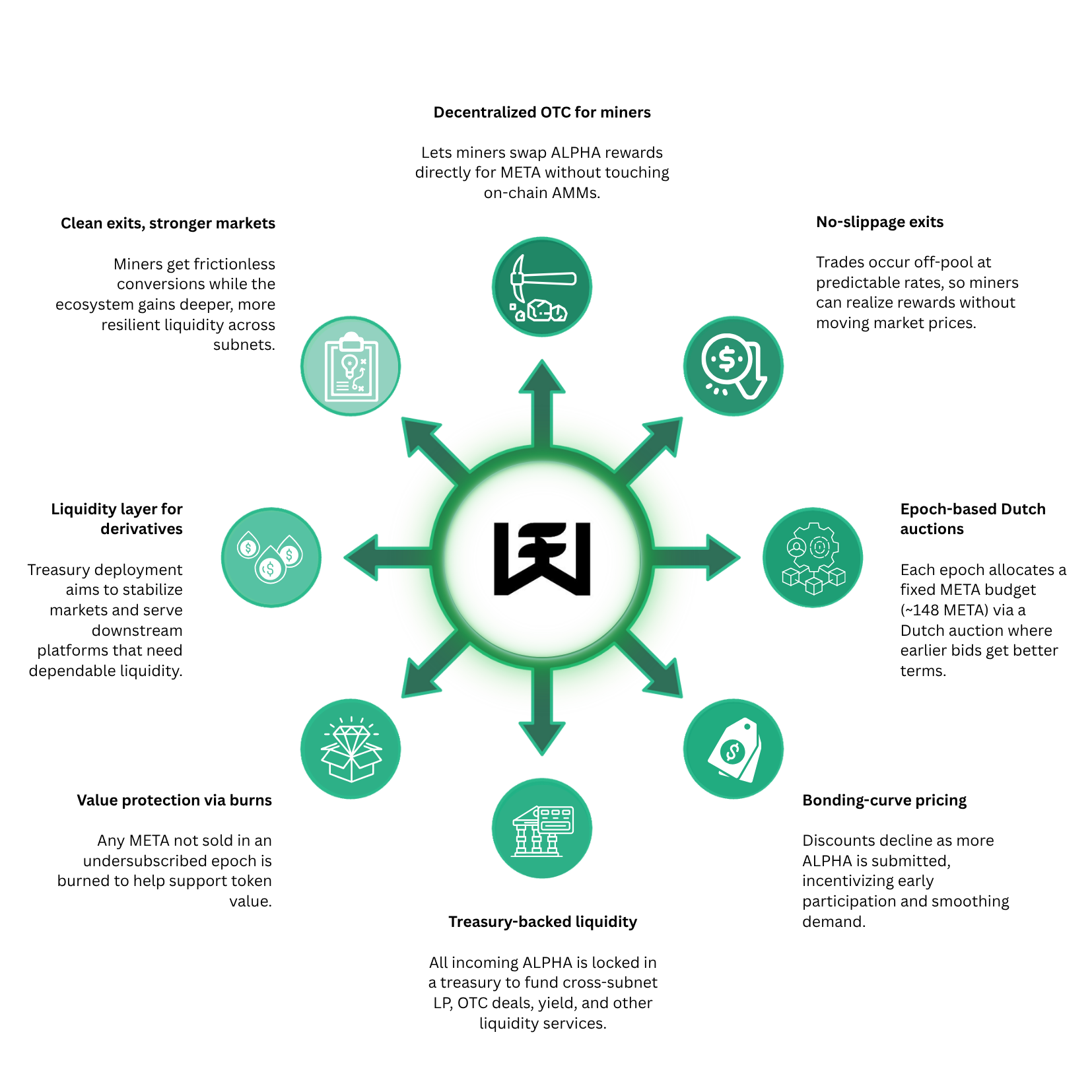 Treasury-backed liquidity: All ALPHA received is locked in a subnet treasury. The dev team indicates this treasury funds various ecosystem supports (liquidity pools, yield strategies, OTC trades, consumption of digital goods, etc.) to “serve as a liquidity layer for derivative platforms”. Unused META (if the auction is undersubscribed) is burned to protect token value.