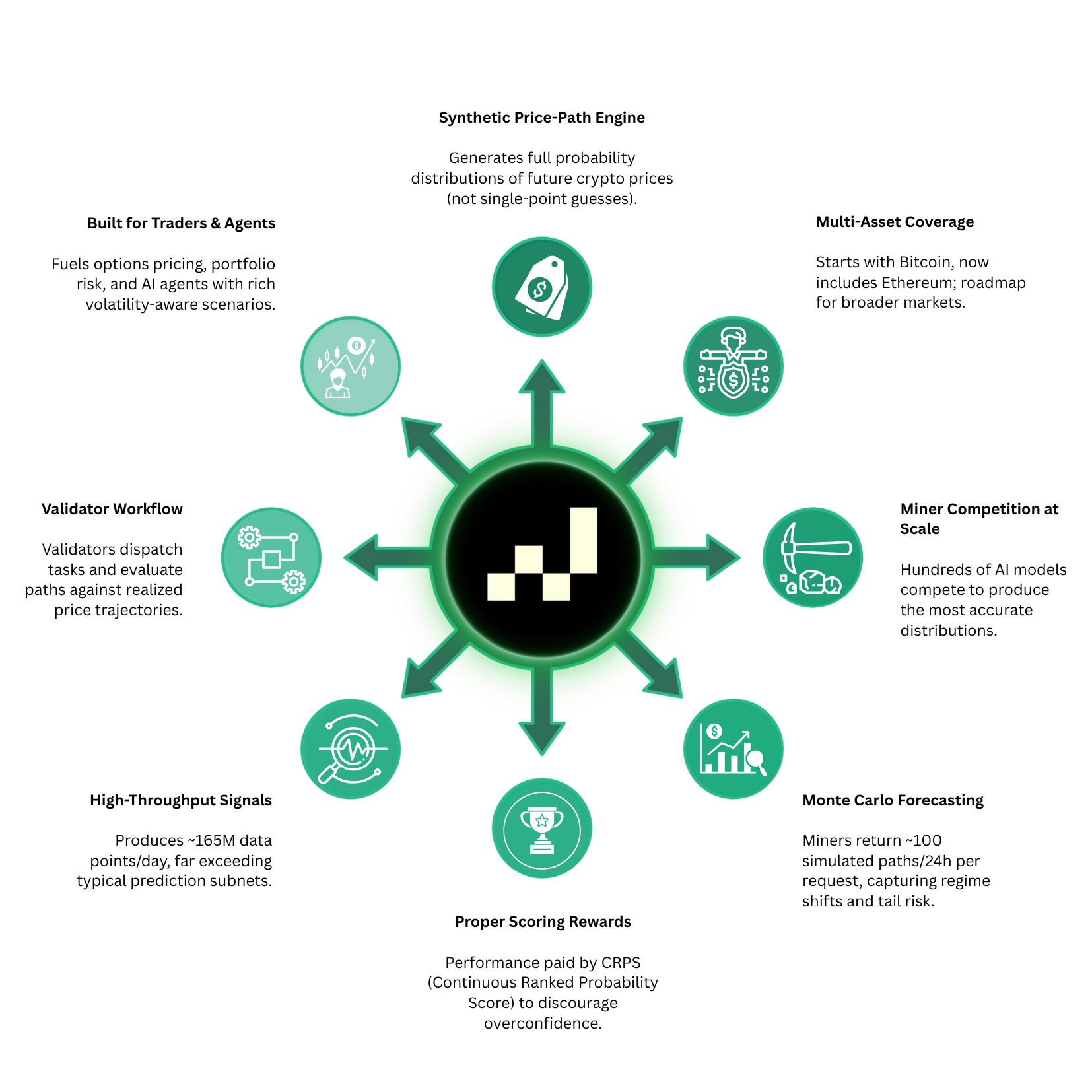 The Synth Subnet aspires to become the leading provider of synthetic price data for AI-driven trading agents, serving as an essential resource for options trading and portfolio management. By offering deep insights into price probability distributions, it aims to revolutionise data-driven financial decision-making.
