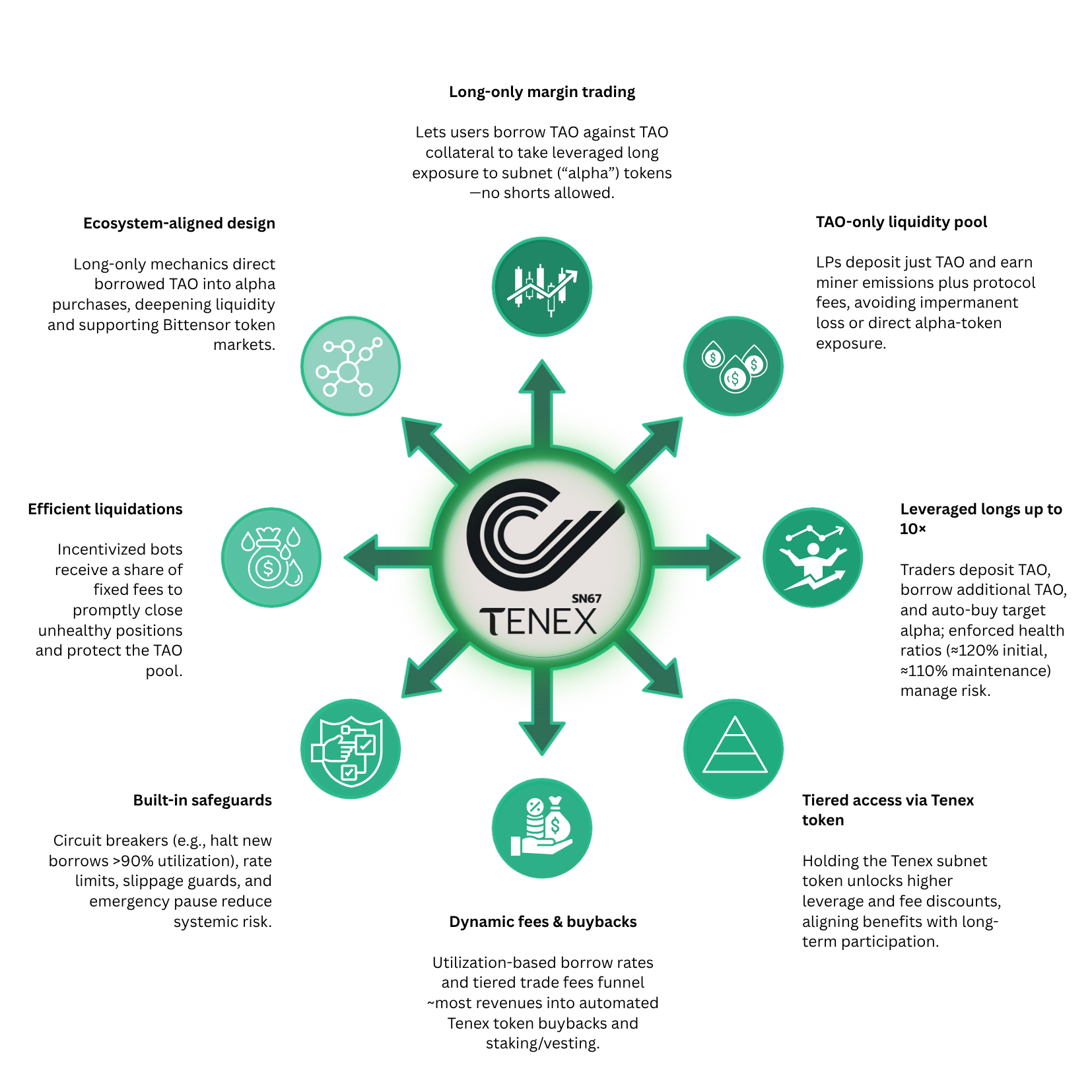 In essence, Tenex brings a DeFi margin trading product into Bittensor’s AI network. It transforms TAO from just a staking/mining token into a tool for financial leverage – all while maintaining the decentralized ethos. Traders benefit by amplifying their exposure to promising AI subnet tokens, and liquidity providers benefit by earning passive TAO rewards and protocol fees. The protocol’s rules (long-only, tiered access, automated safeguards) are carefully crafted to align with Bittensor’s goal of growing the ecosystem (increasing demand for subnet services and tokens) without introducing destabilizing dynamics.